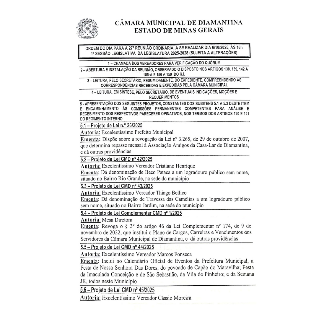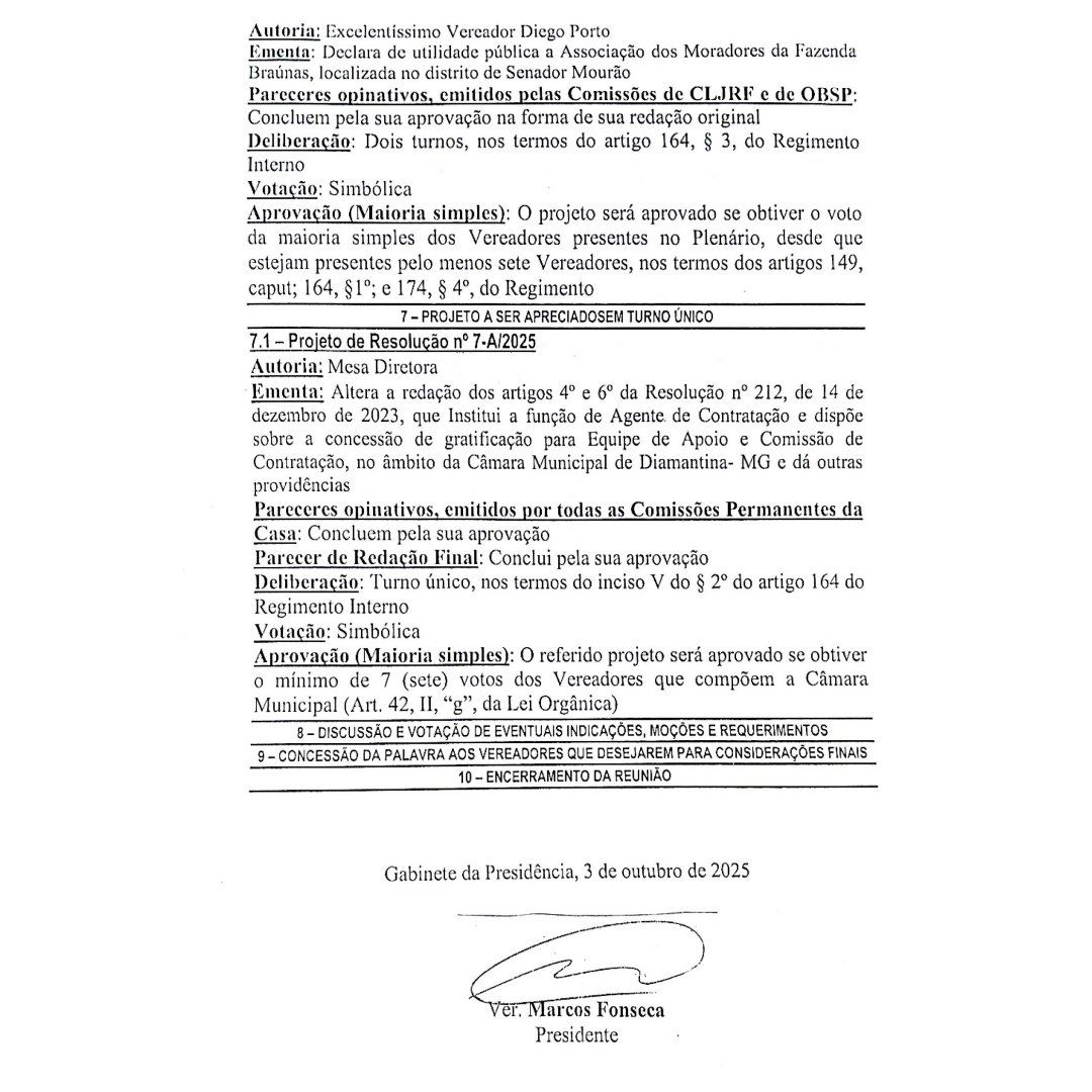 PAUTA DA REUNIÃO ORDINÁRIA - 06/10/2025